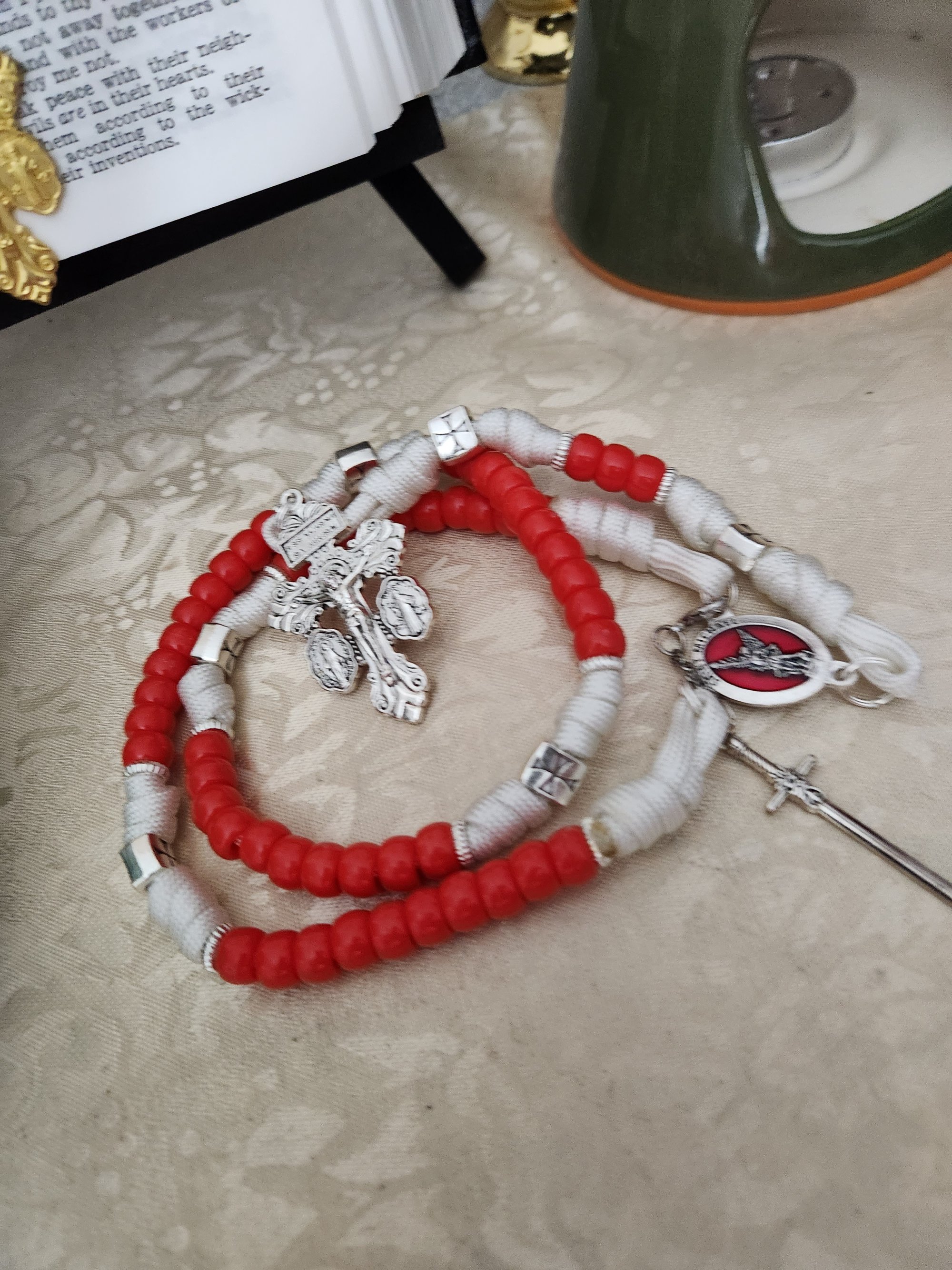 White 550 Paracord, red and silver beads. Saint Michael Archangel center piece with sword.